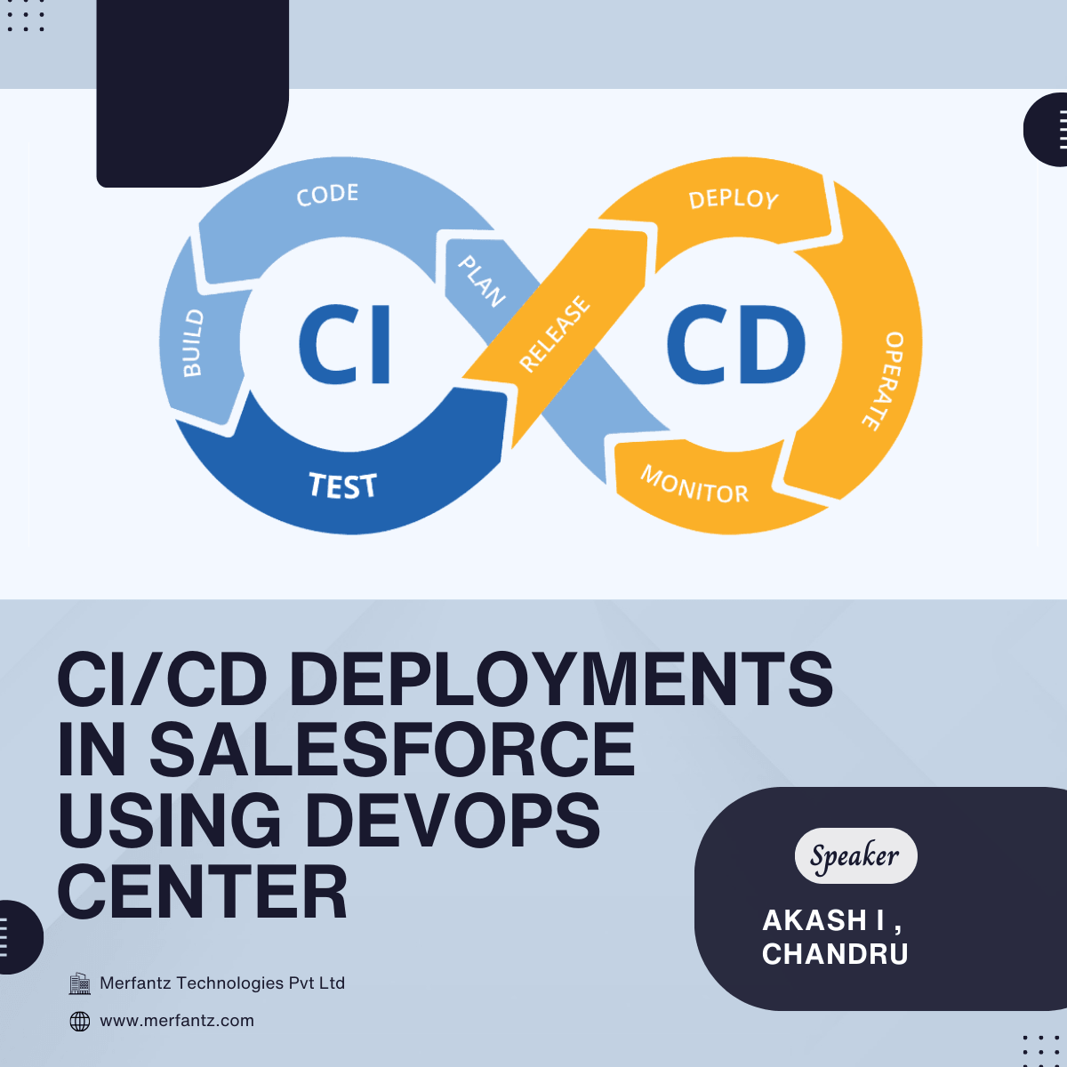 The session was jointly led by Akash I and Chandru, who explained how Salesforce DevOps Center enables structured CI/CD workflows. The discussion focused on managing source control, creating deployment pipelines, and ensuring smooth promotions across environments with improved visibility and governance.